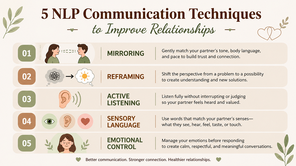 Neuro-Linguistic Programming, or NLP, helps improve communication by teaching you how language, emotions, thoughts, and behavior influence conversations. NLP techniques can help you build rapport, understand your partner’s perspective, and choose words that create connection instead of conflict.