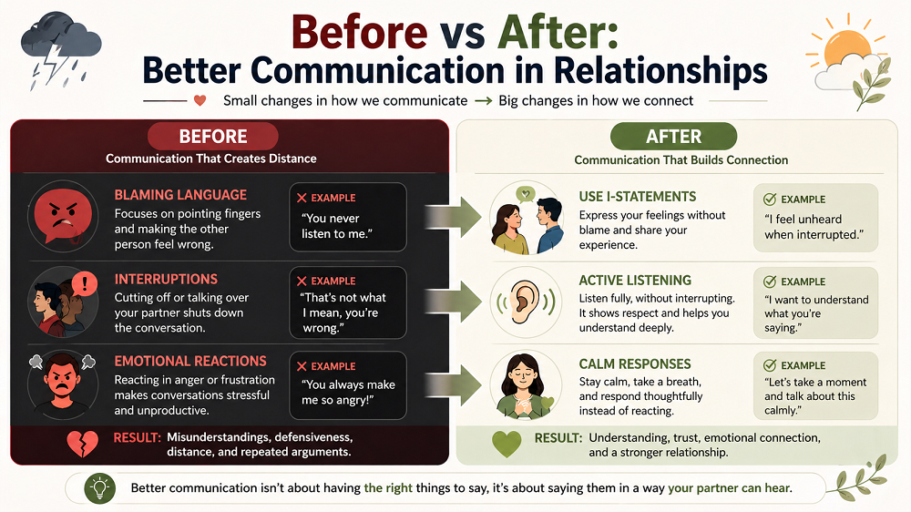 Improving communication in a relationship starts with awareness and intention. Focus on active listening, where you give your full attention instead of preparing a response. Express your thoughts clearly without blaming or criticizing, and try to understand your partner’s emotional perspective. Techniques like mirroring, asking open-ended questions, and managing your emotional reactions can significantly improve how conversations flow and reduce misunderstandings over time.