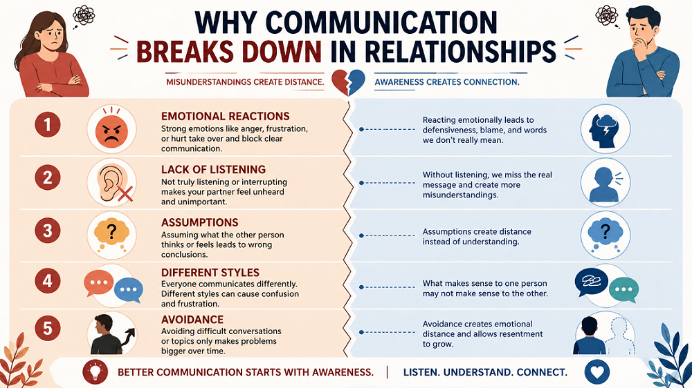 Communication often breaks down when people react emotionally instead of listening. Misunderstandings happen when one person assumes intent, interrupts, avoids difficult conversations, or uses blaming language.