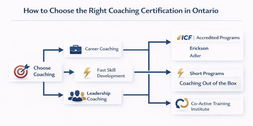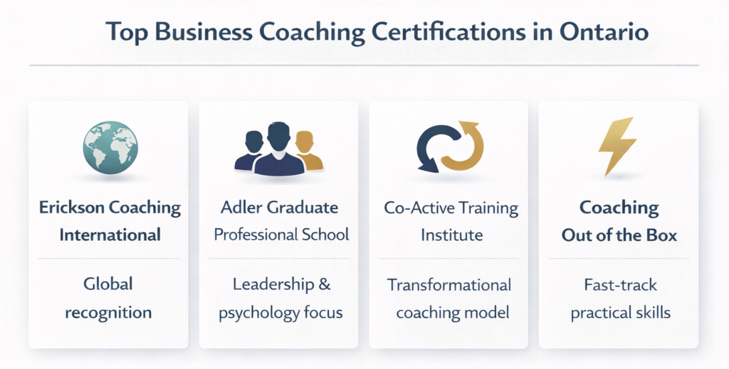 The best business coaching certification in Ontario depends on your goals, but ICF-accredited programs such as Erickson Coaching International, Adler Graduate Professional School, and Co-Active Training Institute are widely considered the top choices. These programs offer structured training, global recognition, and strong credibility for building a long-term coaching career.