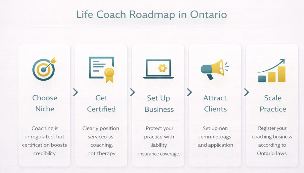 • Becoming a life coach in Ontario does not require a government license, but building credibility depends heavily on certification, niche specialization, and practical coaching experience.