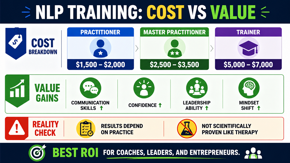 NLP training typically costs between $1,500 and $7,000 depending on the certification level and training provider. Practitioner programs are usually on the lower end, while Master Practitioner and Trainer certifications can cost significantly more. The value depends on the quality of training and practical application.