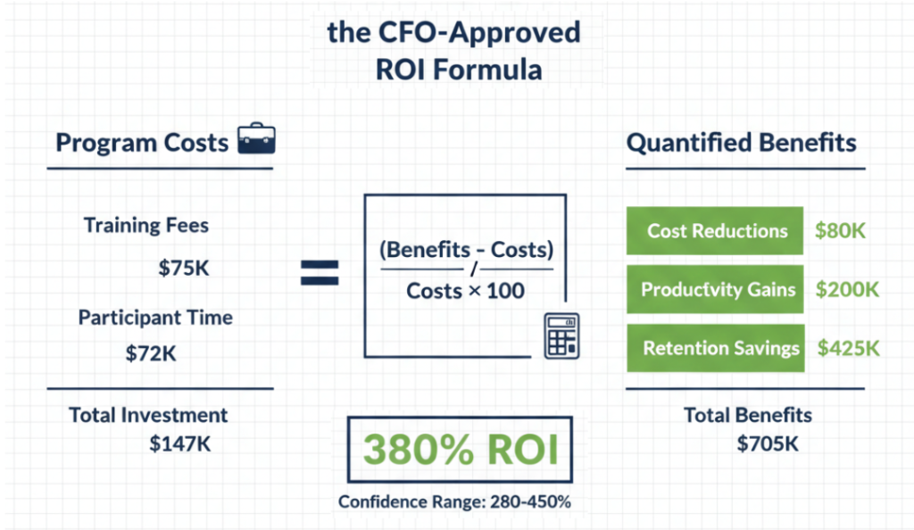 Think back to that opening scenario, you sitting across from your CFO with a $150,000 leadership training proposal. Now you have something different. You have the formula showing 384% ROI. You have the measurement plan proving results in 90 days. You have the objection responses ready for every “but what about…” question. You have the pilot option if they need to start smaller. You have the calculator built with your organization’s actual numbers.